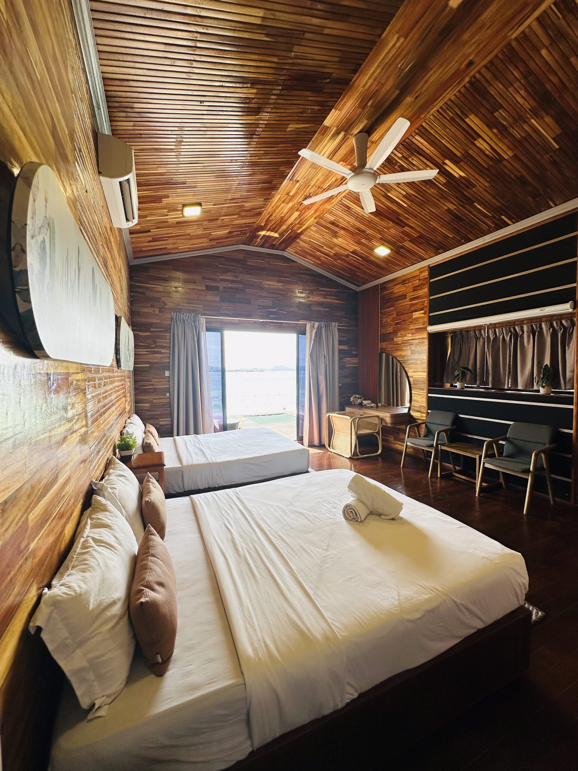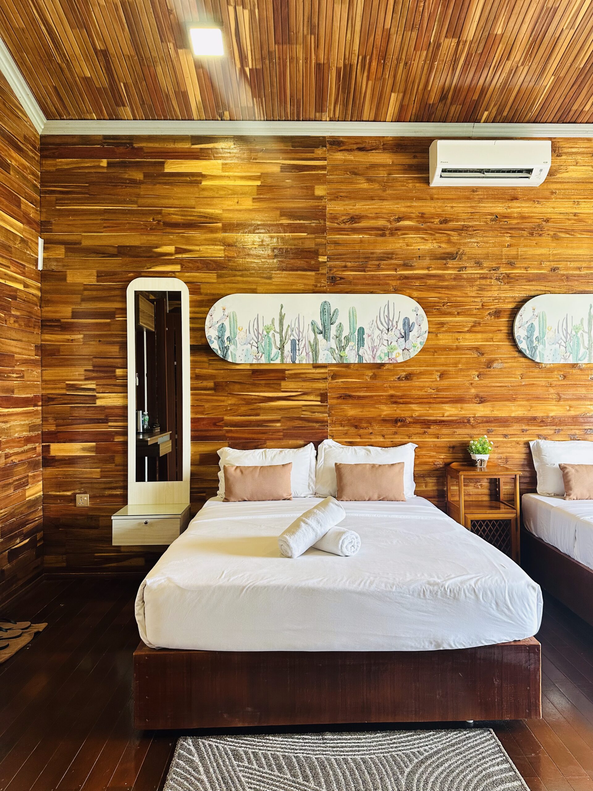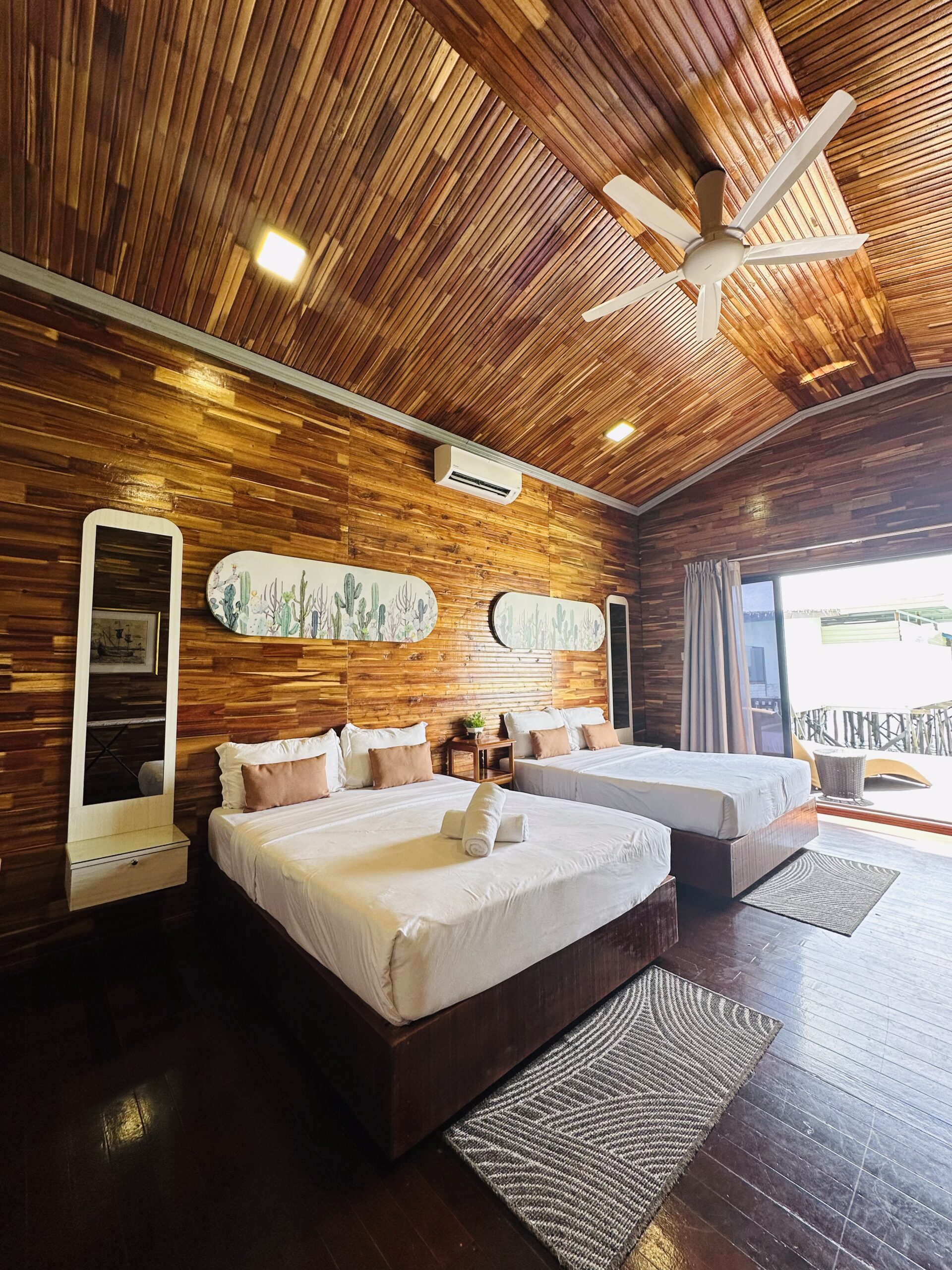 Classic & Wooden Design. Decorated with brownish and classic furnitures to add a beautiful look to the living space, it’s a lovely room for a getaway or weekend staycation. Besides having two queen beds, it also has comfy chairs and a private deck that lets you enjoy the sea view from your room. A dream for any city slickers, imagine drawing the curtains to see a view of the vast ocean right before your eyes!