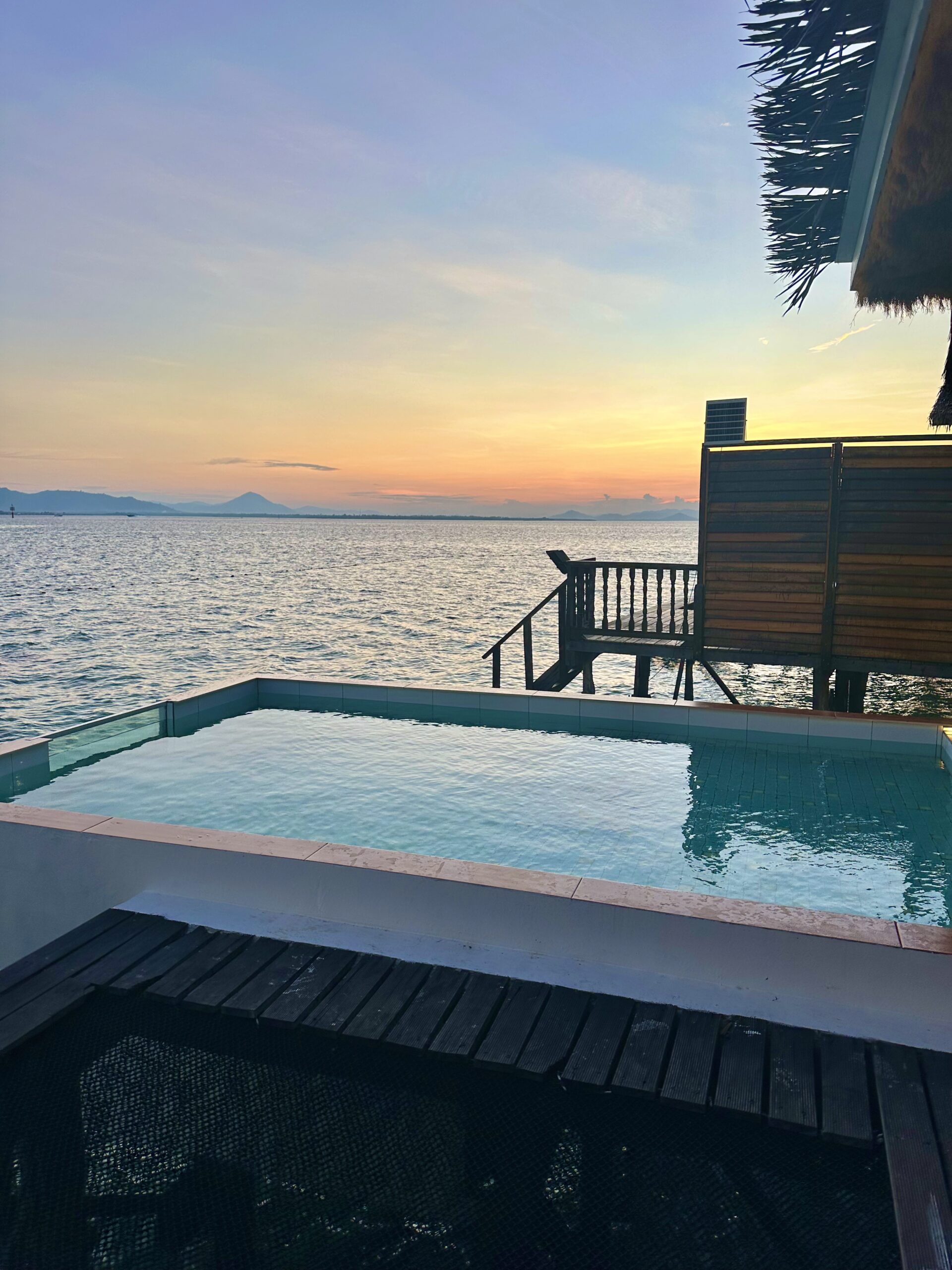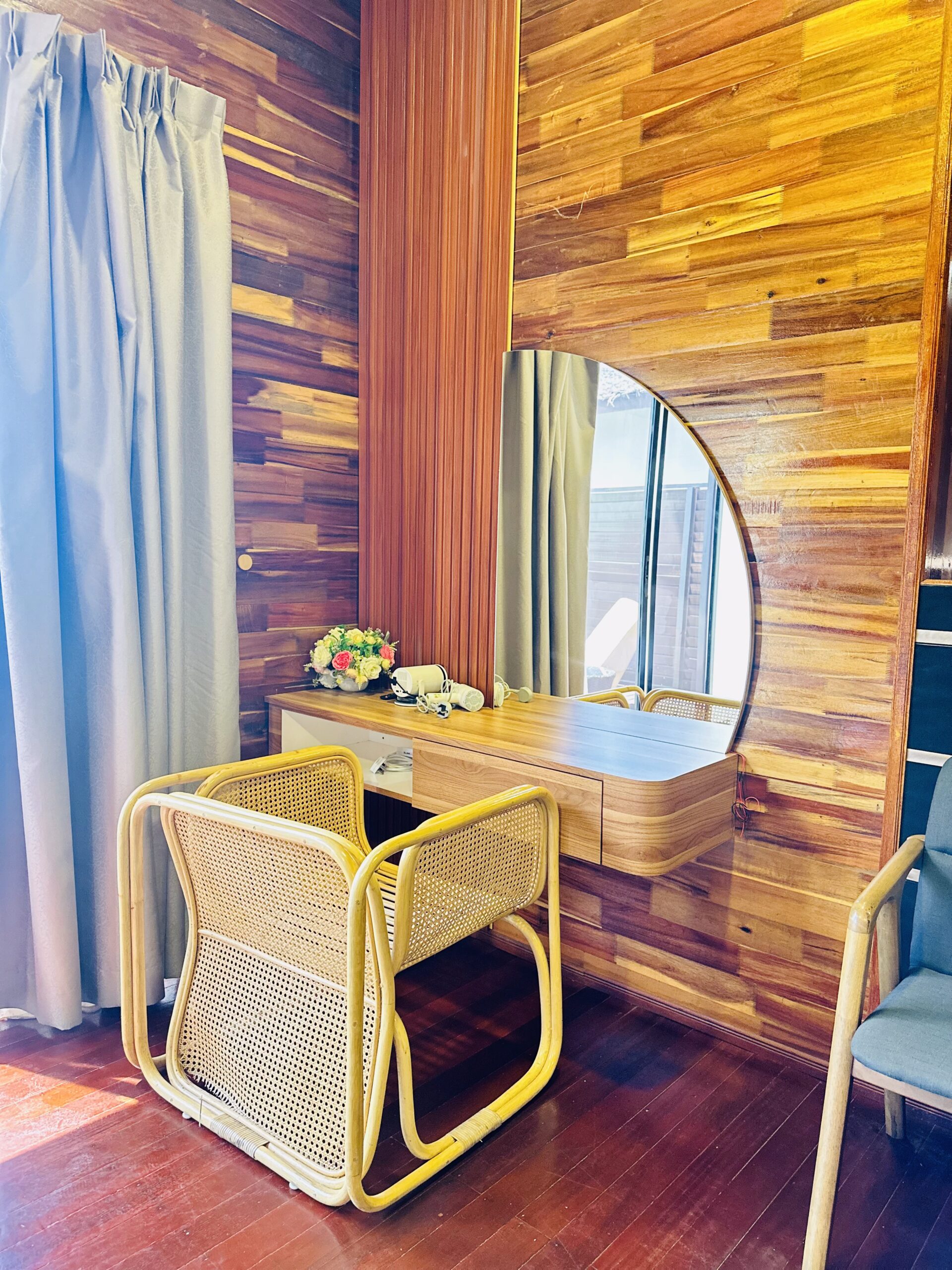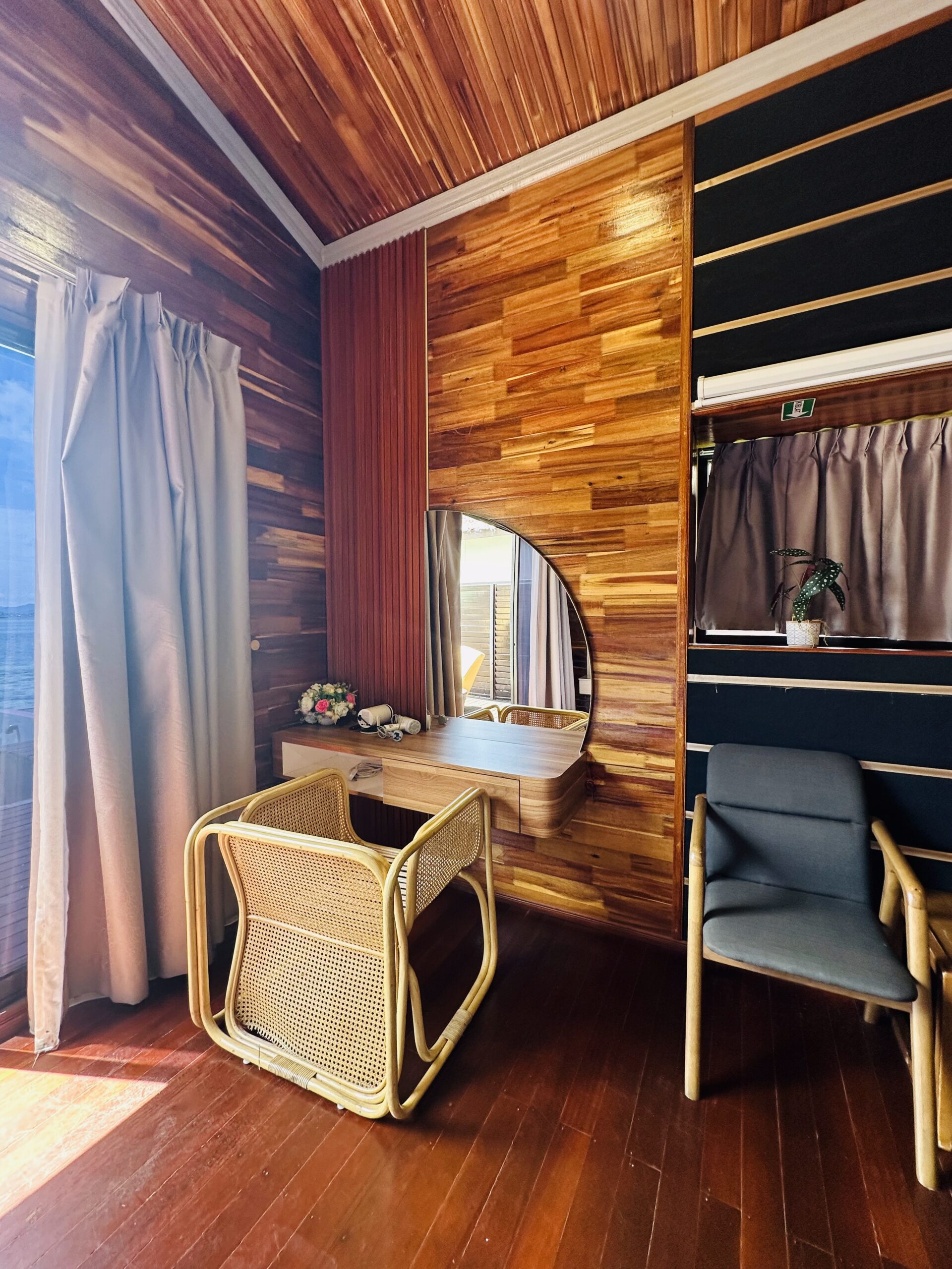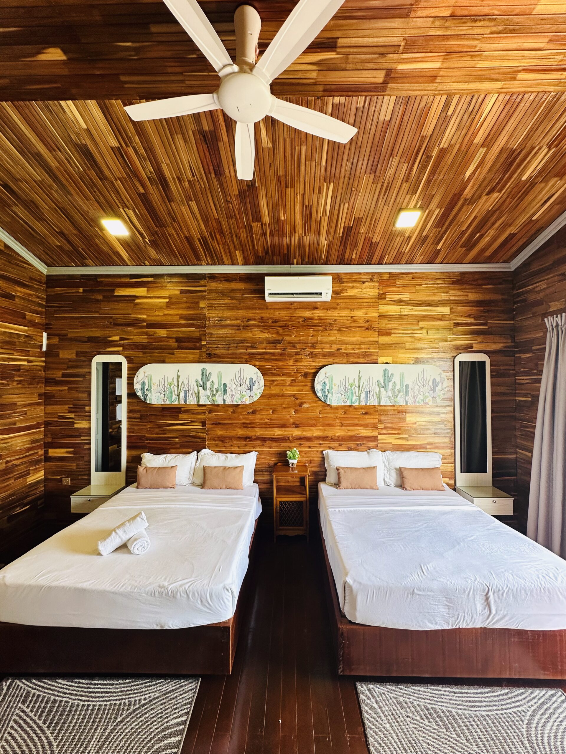 Classic & Wooden Design. Decorated with brownish and classic furnitures to add a beautiful look to the living space, it’s a lovely room for a getaway or weekend staycation. Besides having two queen beds, it also has comfy chairs and a private deck that lets you enjoy the sea view from your room. A dream for any city slickers, imagine drawing the curtains to see a view of the vast ocean right before your eyes!